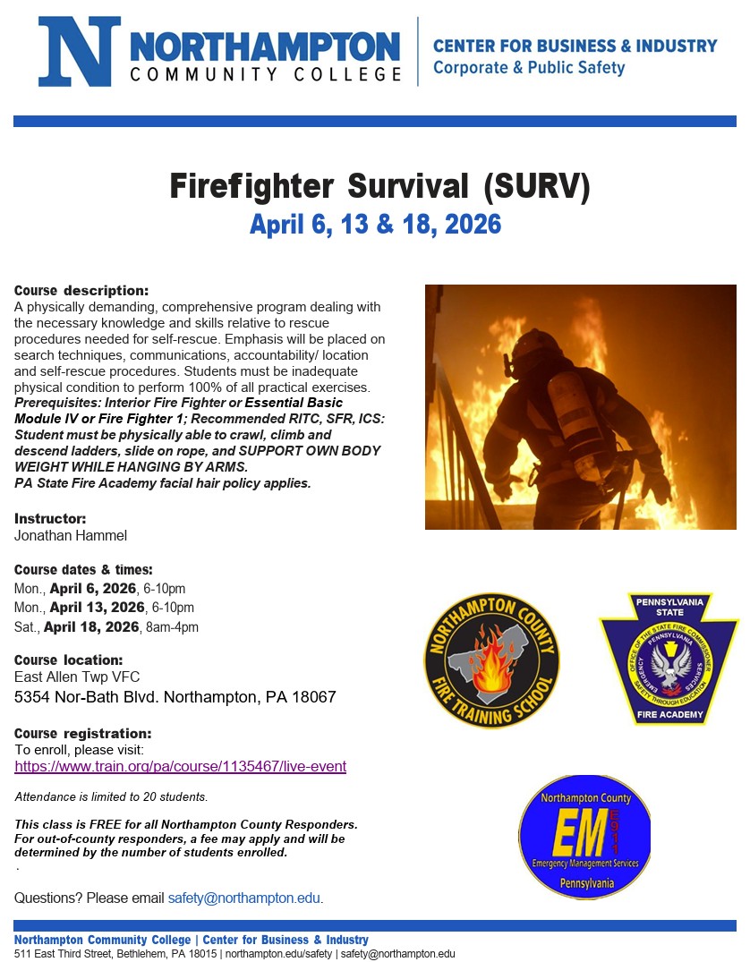 Firefighter Survival (SURV) Mar 4, 2026 Firefighter Survival (SURV) by Northampton County Fire School, Northampton County Emergency Management, Northampton Community College 167 167 people viewed this event. Register for event To register for this event please visit the following URL: https://www.train.org/pa/course/1135467/live-event → Date And Time Monday, April 6, 2026 Location 5354 No-Bath Boulevard, Northampton, PA 18067 Event Types Class, Training, or Workshop Event Category Business & Professional Share With Friends Facebook Twitter Linkedin Xing Pinterest
